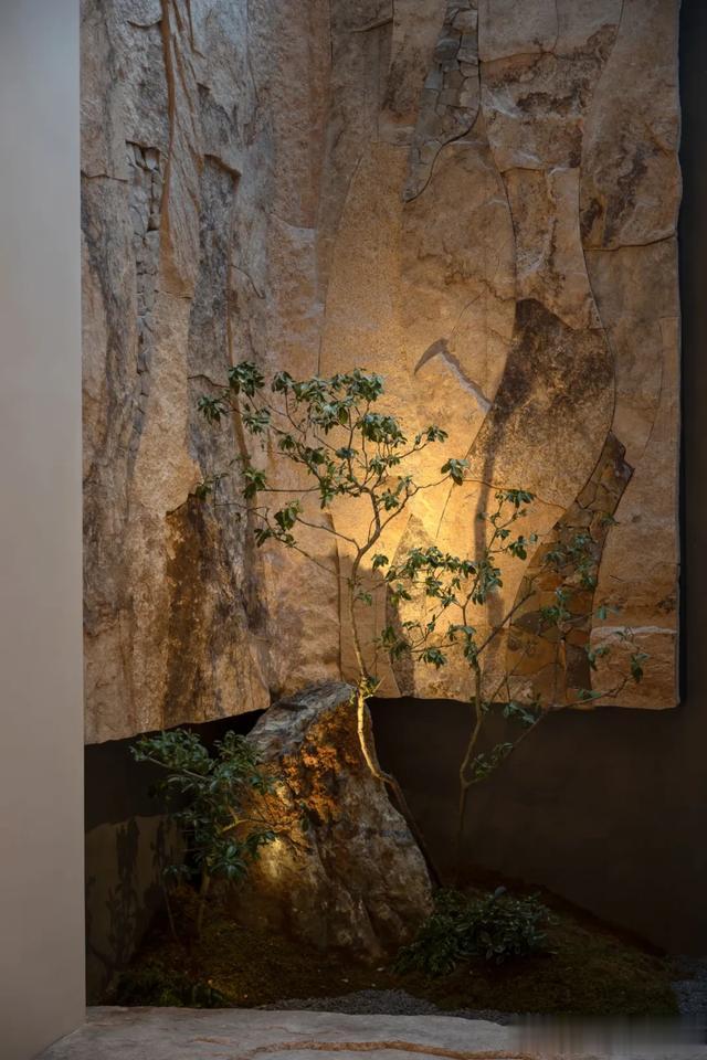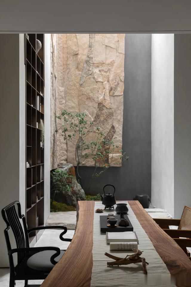 自然光与人造光相结合,将室内花园融入而成为空间的视觉焦点,并顺着一整面墙的自然拼缝的石块,延伸到天井的室外。点香烹茶,静坐冥想,调整呼吸韵律,内观自省。须臾之际,深切感受一种被温柔怀抱所包裹的温暖,建立对当下空间更为纯粹、完整化的感知。