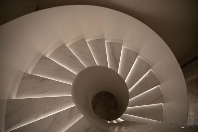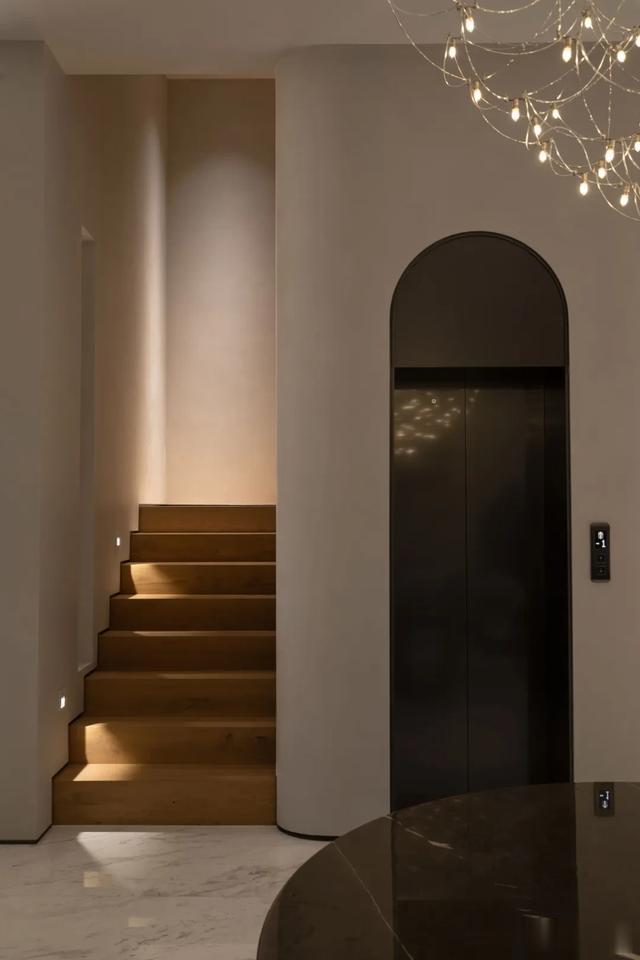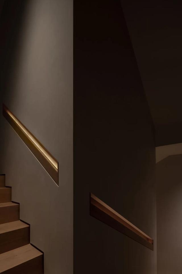 楼梯的自然材质与硬朗线条,配合素雅墙面的柔和曲面,构成和谐的视觉对话,彼此衬托,相得益彰。楼梯间嵌入式扶手的设计在于满足功能而不破坏墙面的整体性,暗藏的扶手灯带连同踏步灯营造出温暖安逸的氛围,徒步上下楼,更添一份乐趣。