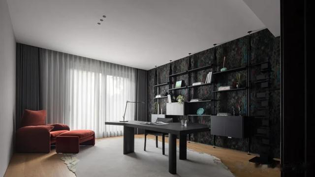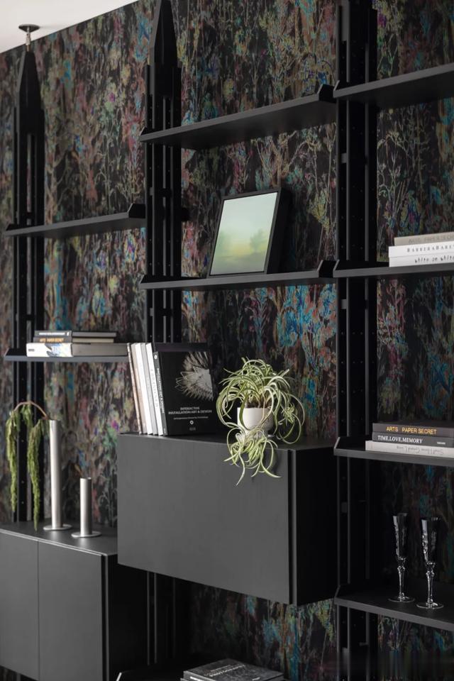 书房的背景墙的设计,体现了空间主人充满创造力的审美与艺术感知力,她一定对色彩与材质有着深入的研究和独到的见解。整面墙的深色花纹壁布,质感如罗纹天鹅绒般柔软,以多彩的颜色组合,饱满地勾勒一幅生动的花束画作,焕发新的视觉生命力,让艺术的格调无限延展。而紧靠着背景墙的cassina经典书架,也让这一背景墙布的图案显得低调而神秘。