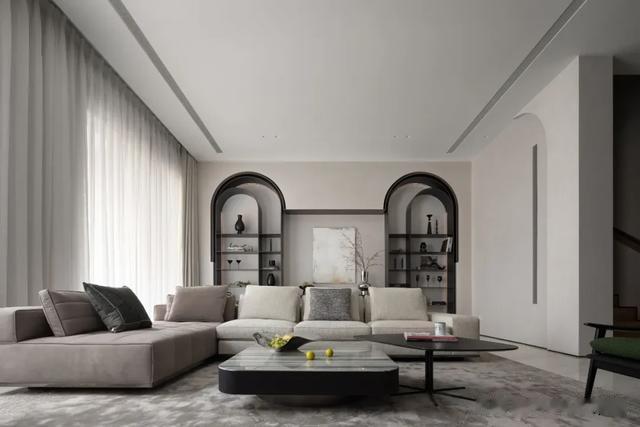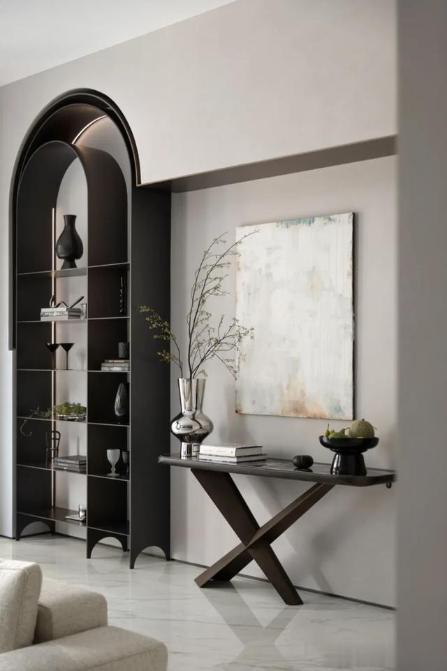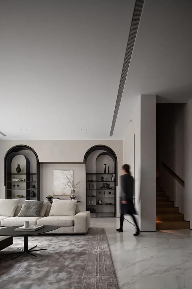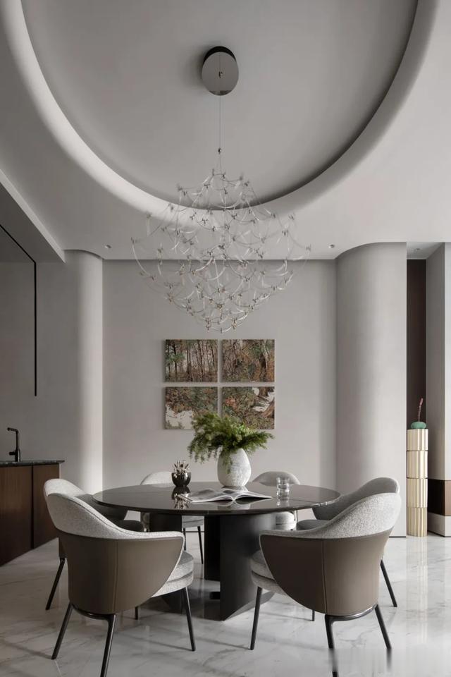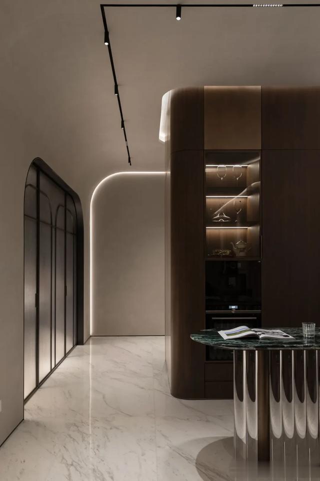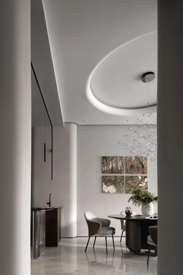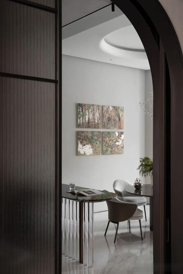 客餐厅整体空间以低饱和的奶油色呈现温润的质地,弥漫出一抹微妙的松弛感,如未完成的慢板乐章,留以无尽遐想。金属镶嵌工艺勾勒出拱形壁龛,仿佛是两扇通往另一个世界的神秘之门。德国艺术家卡斯帕的画作以其独特低调的视觉风格置于其间,平衡了空间的多样性。