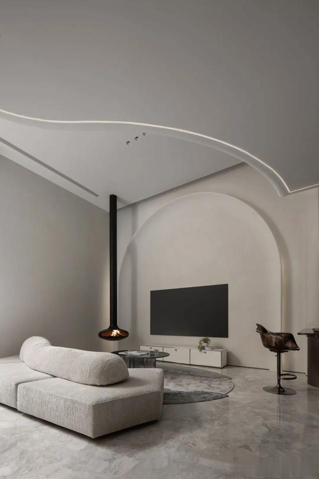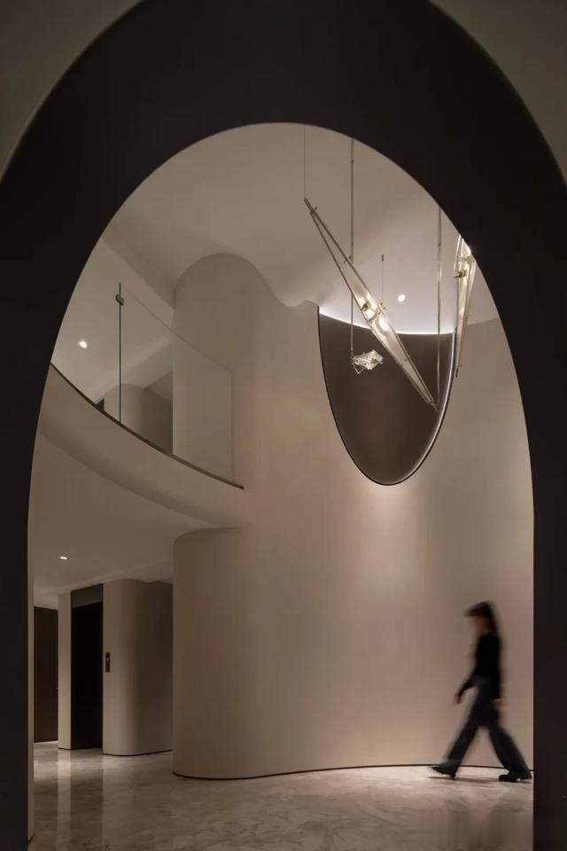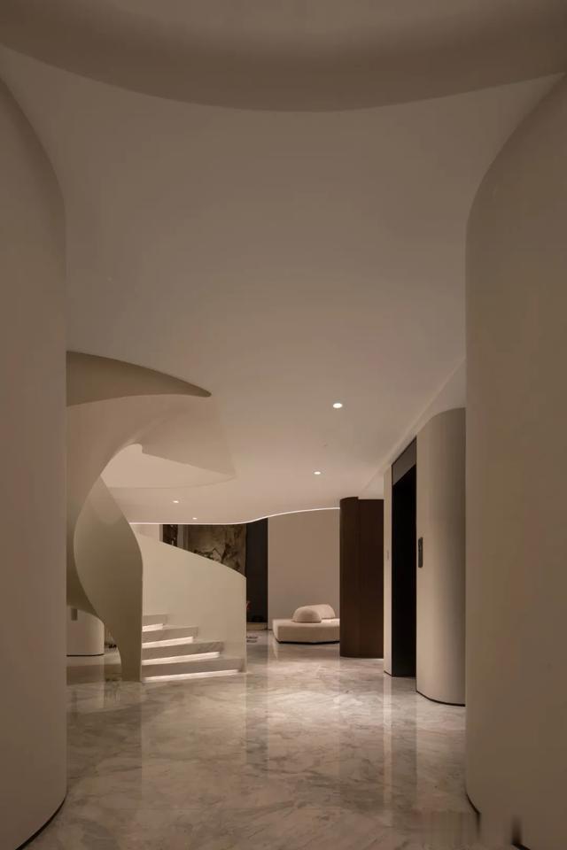 与一层的公共空间不同,本案的两层地下空间的设计中,运用了很多柔和的曲线、弧面的元素,让原本规律而受到各种结构限制的空间,变得流畅、开敞,空间联系紧密而又带有艺术性与未来感。精心设计和调试的灯光场景氛围,使空间散发出与众不同的视觉张力与艺术魅力。