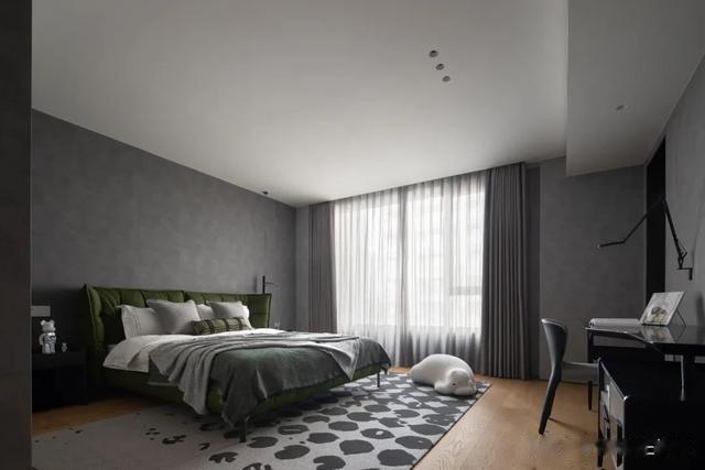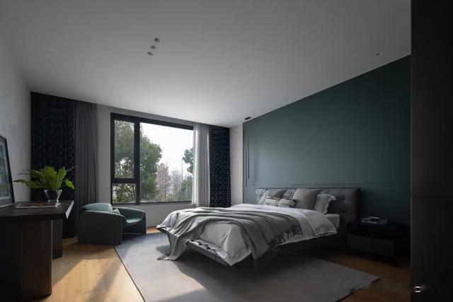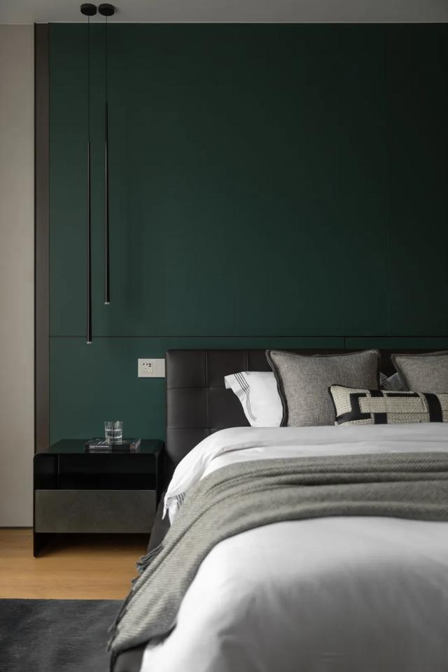 深绿色与黑色交融,顺应人体对睡眠环境的本能渴望,浸沫在内敛而安静的栖息之地。窗外树枝摇曳,自然的光线悄然洒落,空间绿植茂然生长,洋溢丰茂又精致的生命张力。