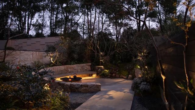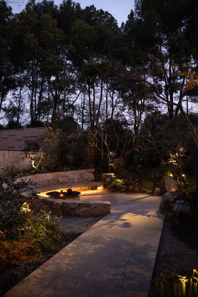 客厅外的前庭院,是一方完整的充满自然山野趣味的自在院落。一条石砖步道,踩着树木的影子径直深入,通向一处用大块天然原石砌筑的椭圆形小广场,傍晚点起篝火,听风饮茶,尽享舒适惬意。