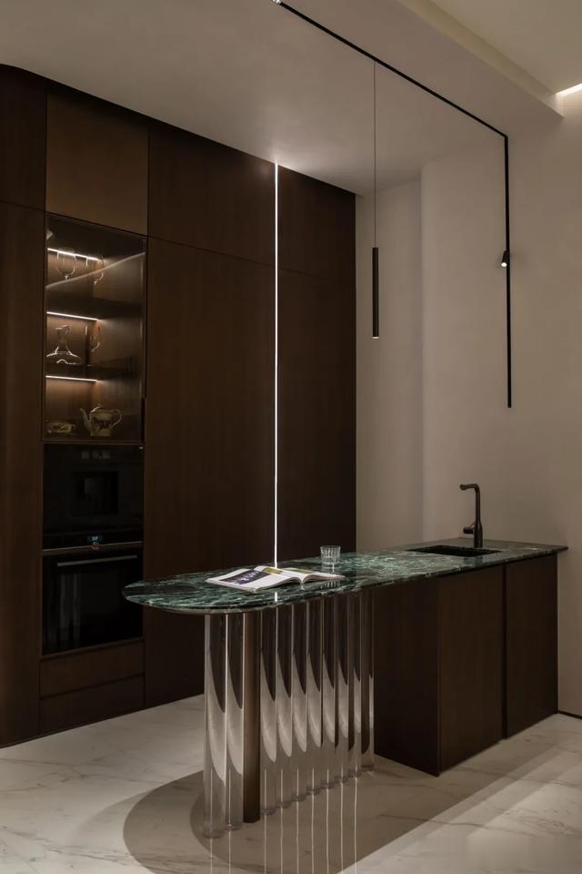 绿色大理石台面的水吧台给人印象深刻,而水晶质感的吧台柱脚,体现了细致的设计和工艺细节。