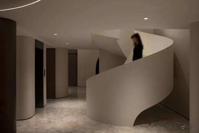 白色的旋转钢楼梯,处在整个地下空间的中心,简洁流畅的弧线,如同一个精心打磨的现代雕塑,串联起地下室的两层公共空间,与两端的两处挑空空间呼应着,让整个地下室空间流动了起来。