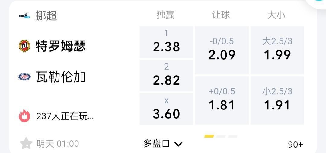 盘口推荐:特罗姆瑟-0.25球