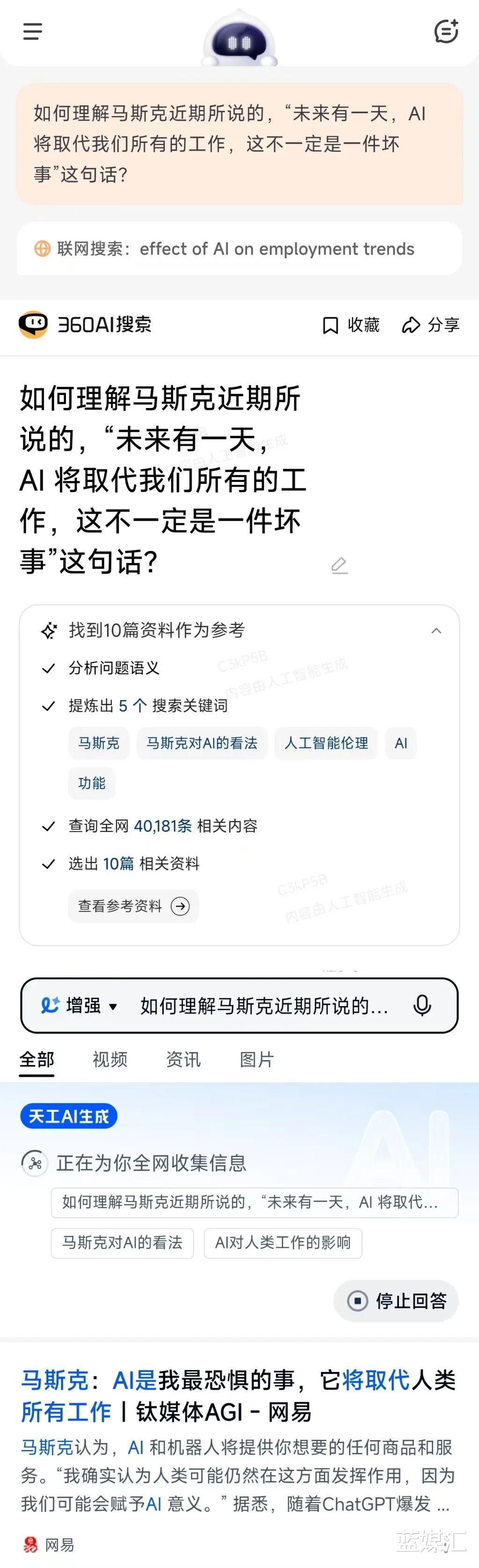 以当地时间5月23日马斯克的发言为例,除去Kimi直接给出了解答而没有显示从网上检索相关资讯的步骤外,百川智能百小应、360 AI搜索及天工 AI助手的第一步都先将用户的提问筛选出关键词,进行了一定范围内的信息筛选。