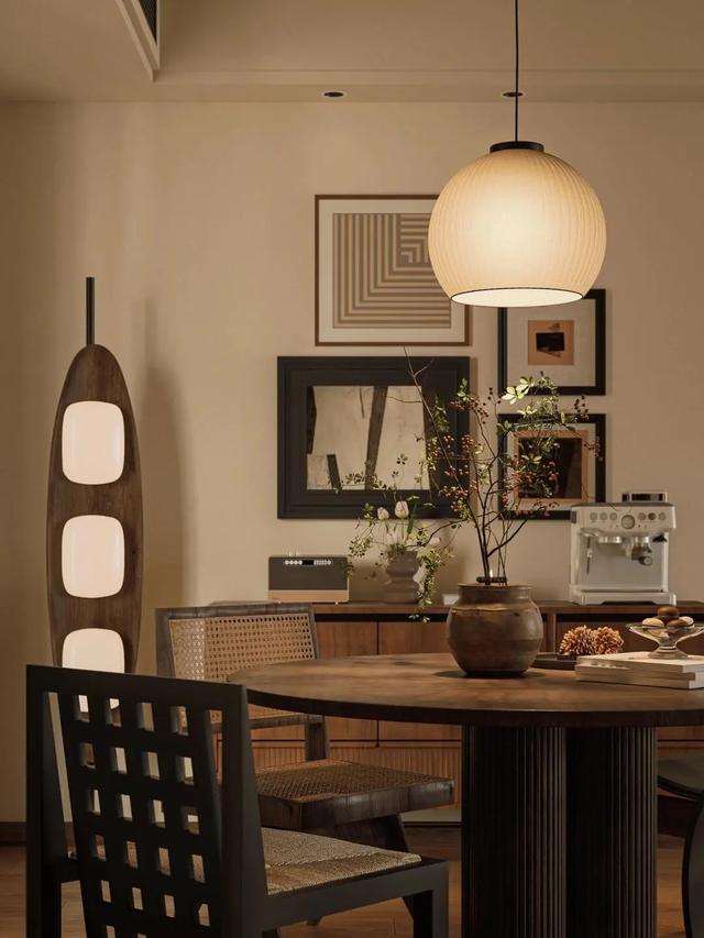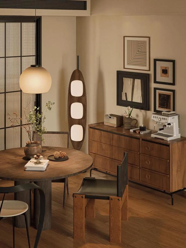 餐厅的设计延续了客厅的风格,胡桃木质感的餐边柜,搭配复古圆桌,中古矮柜和复古挂画,以及设计感十足的落地灯,营造出浓厚的就餐仪式感。在这里,我可以和朋友们一起享用美食,品味生活的美好。