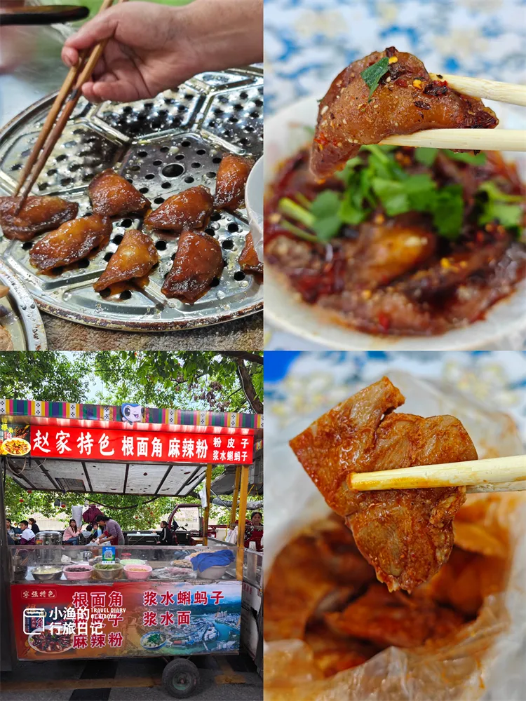 根角面有点类似饺子的做法,外皮儿是用野生蕨根粉做的,里面包着豆腐、豆芽,然后蒸熟调汁,口感是酸酸辣辣的,蛮好吃的。