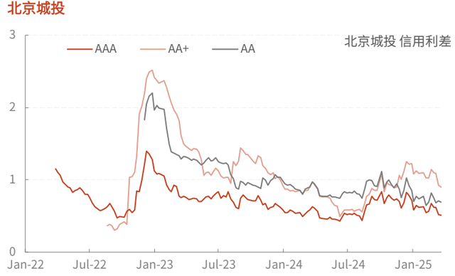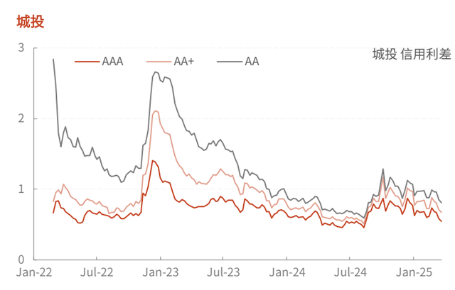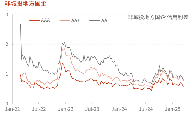 上周各等级城投和非城投信用利差均下行。三个级别的城投信用利差分别下行3.1BP、下行3.9BP、下行4.6BP;三个级别的非城投信用利差分别下行1.3BP、下行3BP、下行3.2BP。
