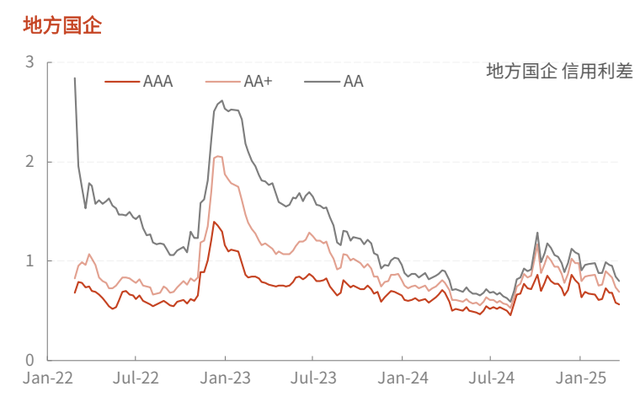上周国企信用利涨跌互现,民企信用利差整体下行。三个级别的中央国企信用利差分别上行0.4BP、下行0.5BP、下行2BP;三个级别的地方国企信用利差分别下行2.2BP、下行4BP、下行4.3BP;三个级别的民营企业信用利差分别下行0.7BP、下行1.9BP、下行2BP。