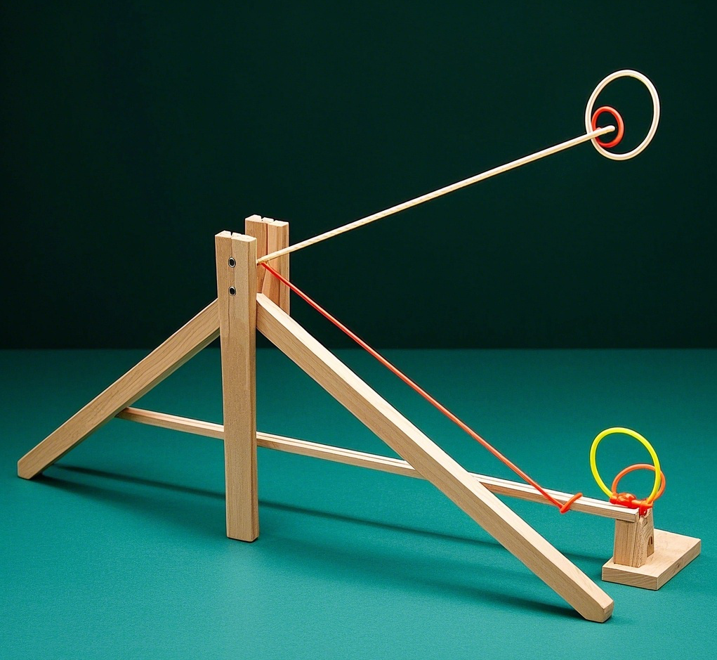 科学原理(教育合规方向)能量转换:橡皮筋形变存储弹性势能→抛射臂摆动转化为动能(E=½kx²)。