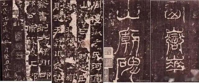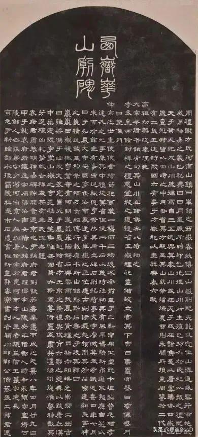 西岳华山庙碑立于延熹八年(165),隶书,典雅壮伟。在汉人八分最为险劲,已开魏碑之先河。汉碑极少留书者姓名,此碑文末有“書佐新豐郭香察書”名款。碑文记述历朝帝王封禅祭天地的祀典和当朝弘农太守袁逢主持重修华岳庙碑的经过。