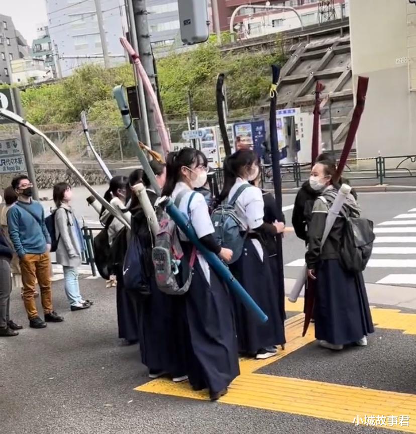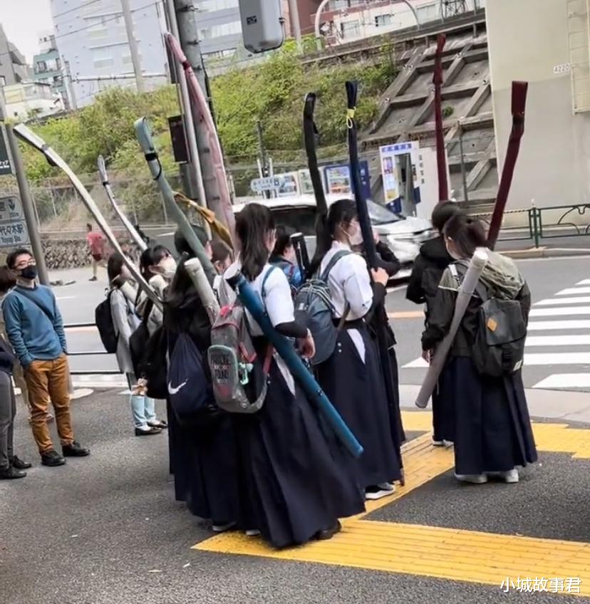 一位中国留学生在日本街头拍到这样一幕:七八个日本女孩每人拿着一根2米长的“棍子”。