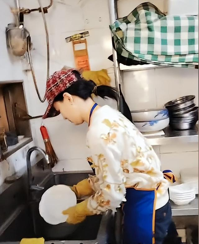 她放下了明星的光环,走进苍蝇馆,成为一名普通的服务员,她每天在餐馆里做洗刷、端送、收钱这些基础活儿。