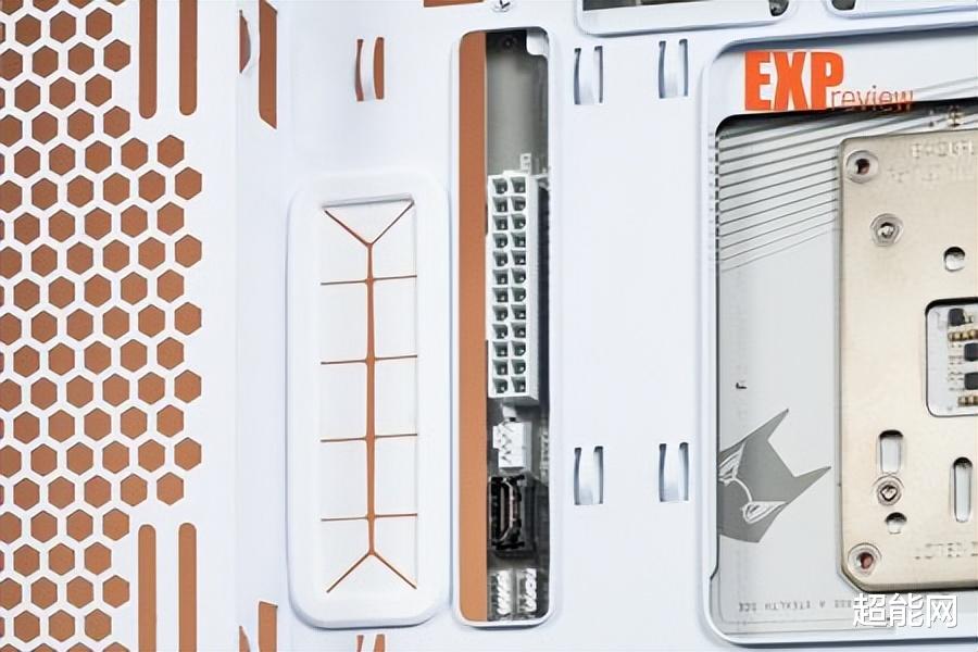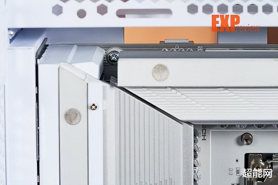 主板的固定螺丝孔都被巧妙的隐藏了,主板下半部分的螺丝孔全部被巨大的散热装甲覆盖,当中覆盖主板右上角的那个其实是一条软磁铁,另外两个都是硬质金属装甲。上半部的螺丝孔则被两块专用的磁吸挡板遮盖,实际上那个主板散热装甲有一半也是磁吸定位固定的,另一端则采用弹性旋扣,拆装都无需工具,非常方便,这隐藏螺丝孔的设计完全不会妨碍装机。