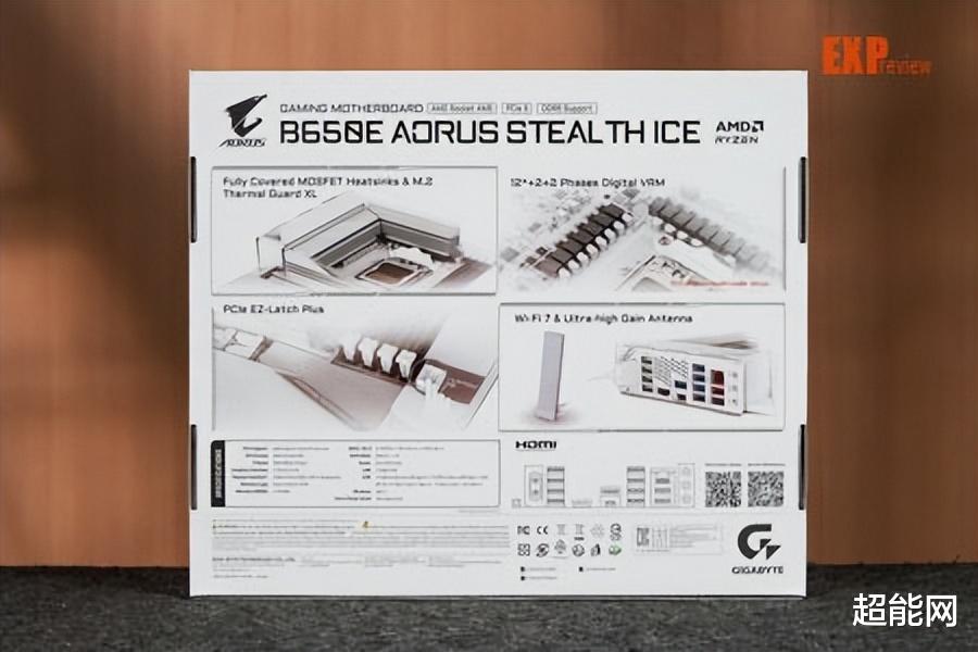 技嘉B650E AORUS STEALTH ICE作为冰雕系列产品,它采用了全白色的包装,包装正面印有主板的型号和技嘉AORUS的雕型Logo,而背面则印有主板的特性,很明显的写着主板采用12+2+2相供电设计,使用6层PCB,具备 多种DIY快易拆功能,支持WiFi 7,主板采用了新一代金属散热设计,这些坚固的散热装甲旨在让您的系统在高速运行时保持凉爽。