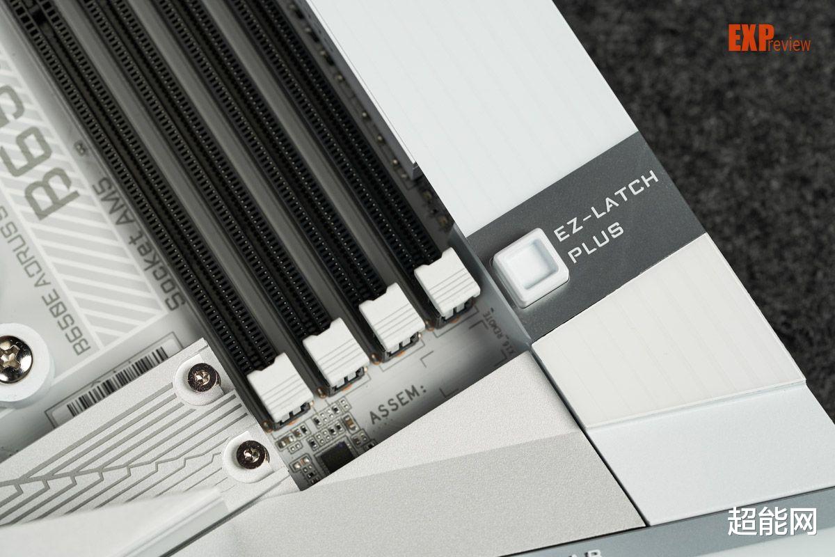 主板上有3条M.2插槽,其中最上方的M.2插槽是直连CPU的PCIe 5.0口,最长可支持M.2 22110规格,为了照顾PCIe 5.0硬盘的大发热量,技嘉为其配备了堆叠鳍片式散热装甲,四层散热鳍片能够提供更好的散热性能,散热装甲和M.2锁扣外壳同样属于技嘉的超耐久设计,在X/Y轴两个方向对M.2 SSD有着一定程度的抗干扰作用,减少传输信号的衰减。采用了弹性旋扣的人性化快拆式设计,固定M.2 SSD和散热装甲时按下即扣,非常方便。