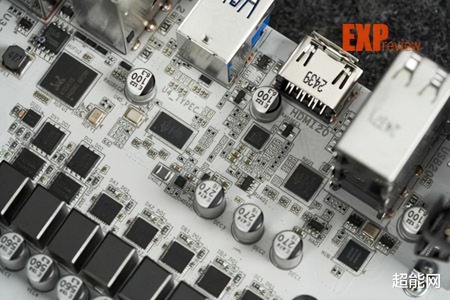 背板I/O这里加起来一共有12个USB口,包括1个USB 20Gbps Type-C口,这接口还支持DP 1.4视频输出,最高支持3840x2160@144Hz,如果你使用锐龙8000G处理器的话这接口其实能跑到40Gbps。其他的还有四个红色的USB 10Gbps Type-A口,五个USB 5Gbps Type-A口,四个白色的USB 2.0口。还有一个后置的HDMI 2.1口,最高支持4096x2160@60Hz。