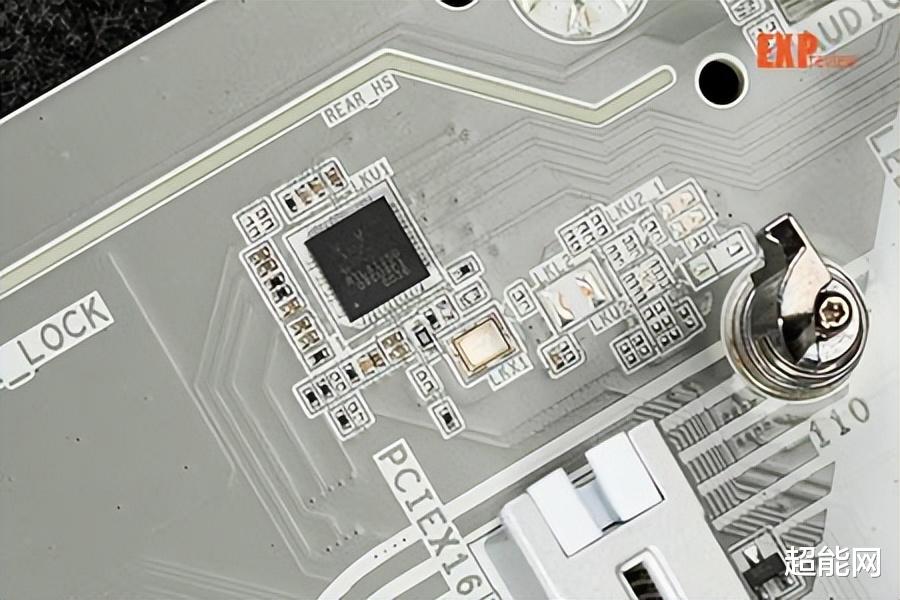 主板音频电路位于左下角独立区域,采用Realtek ALC897声卡,是一款非常经典的8声道高清音频芯片,旁边还有四个音频专用电容。