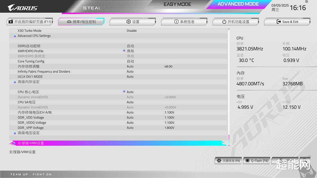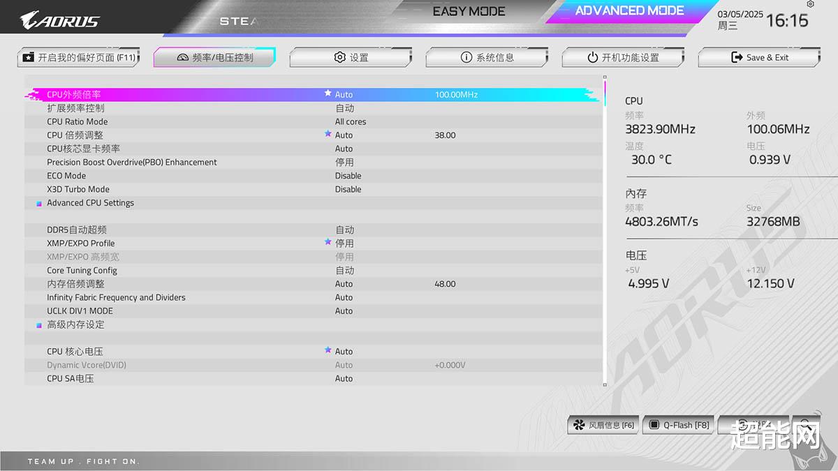 按F2切换成高级模式后,技嘉将CPU超频和内存超频的一些主要参数都罗列到了一级菜单上,比如CPU倍频调整、105W模式、内存倍频、电压调整等选项,查找起来十分方便,右侧区域则用于显示设备的主要运行状态。
