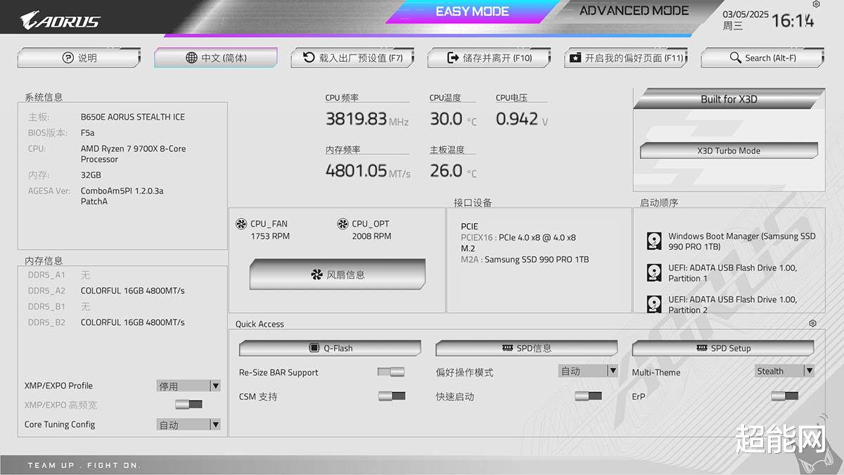 主板BIOS体验技嘉B650E背插冰雕作为是冰雕系列产品,所以BIOS默认是灰白色的浅色主题,而且加入了许多RGB元素。简易模式下的界面布局和功能上都做得相当到位,平台的基本信息、内存设置、风扇设置、存储设置等模块都能够很容易找到,不存在什么很难发现的模块。
