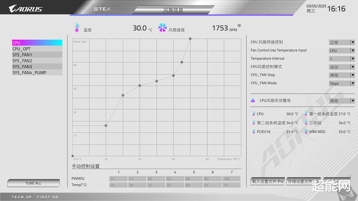 风扇转速设置页面则几乎包括了所有可调参数,用户无需再去高级模式中一个个进行调试,既可以直接拉动曲线进行调整,也可在右边选项里直接进行详细的设置。