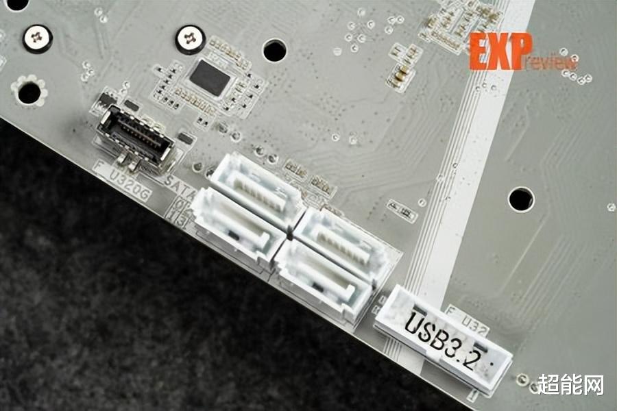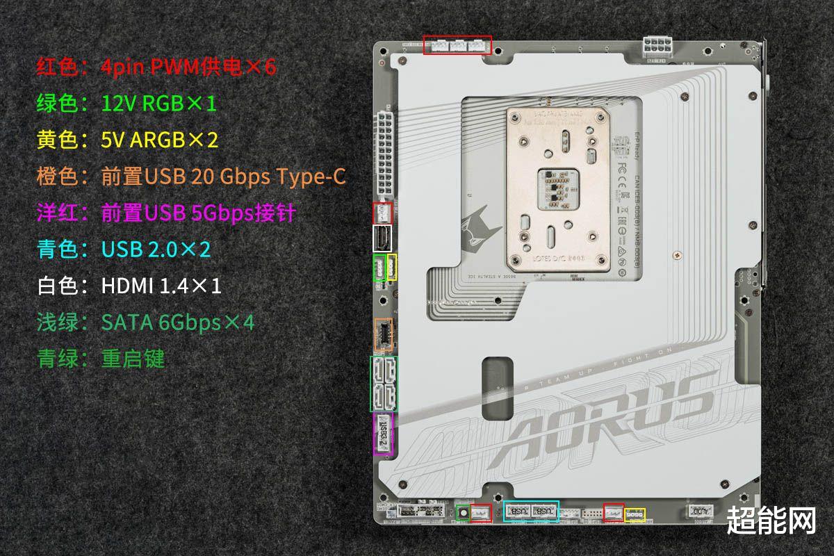 作为一款背插主板,它的接口基本都位于背面,有四个SATA 6Gbps口,一个前置USB 20Gbps Type-C扩展口,一组USB 5 Gbps扩展针脚,可扩展2个USB 5Gbps口,两组USB 2.0扩展针脚。风扇接口主板一共有6个,顶部有3个,左侧一个,底部有一个,完全够用,灯带接口就只有1个12V RGB和2个5V ARGB的,可满足各种需求。
