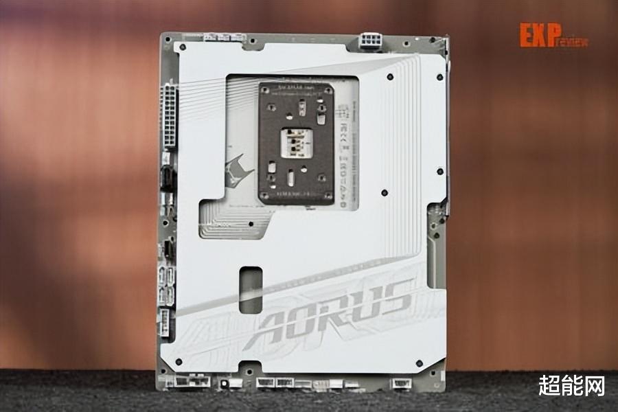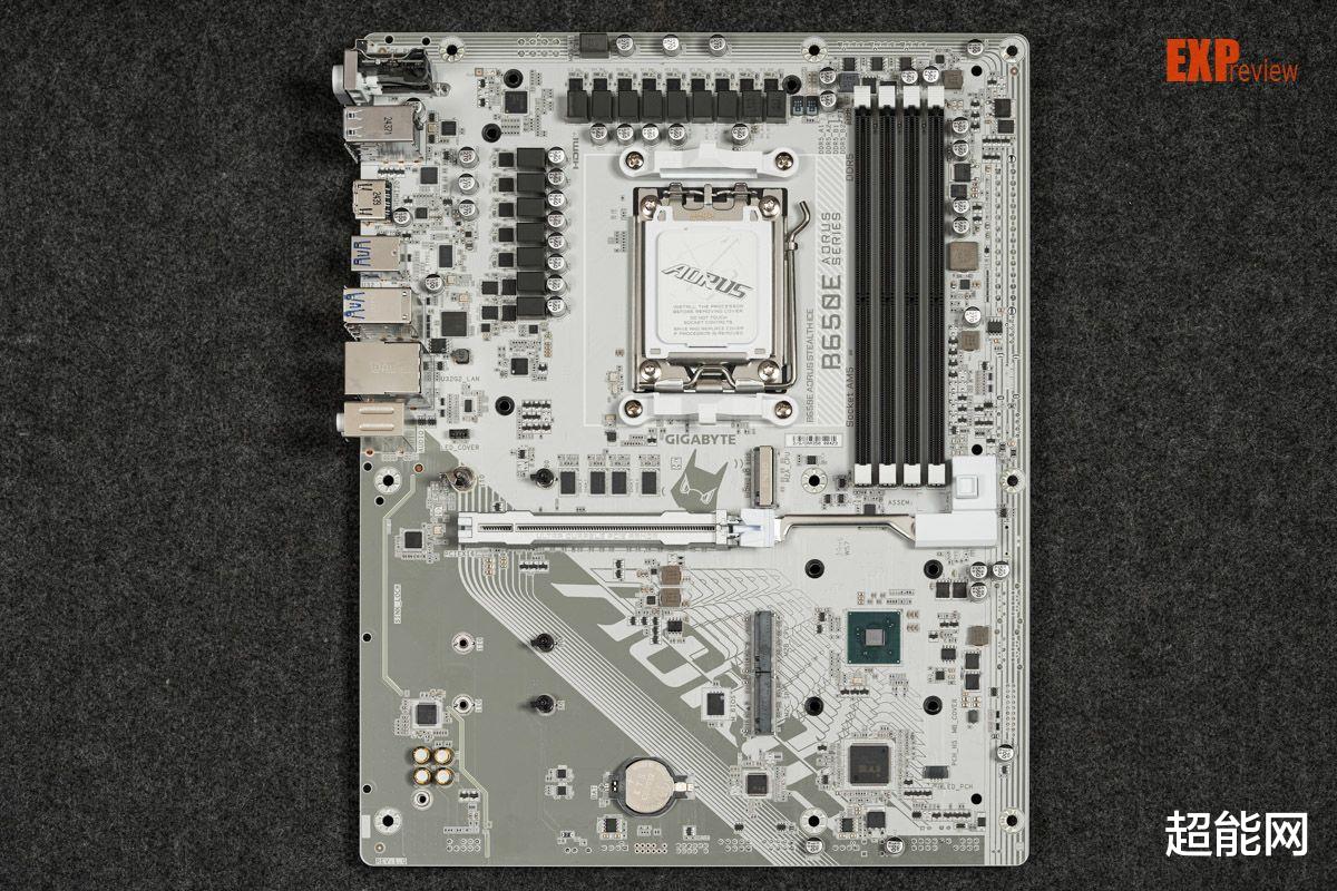 技嘉B650E背插冰雕拆解后的样子,说真的,把大量接口移到背面后,主板的下半部位显得非常空旷,有大面积的空白PCB,但主板其实已经把CPU和FCH的大部分PCIe通道都用上了,只能说B650的扩展性能也就这样。