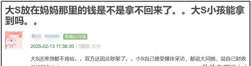 此前也有业内透露大S有一部分财产是给S妈管理,按理说就算和汪小菲离婚,也不至于追着要钱。