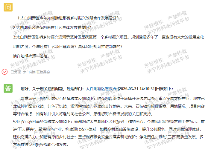近日,济宁名城事小编相关渠道获悉,有网友在济宁市网络问政平台咨询太白湖新区乡村振兴相关工作进展以及如何融合发展等相关问题,太白湖新区管委会就相关问题作出答复。