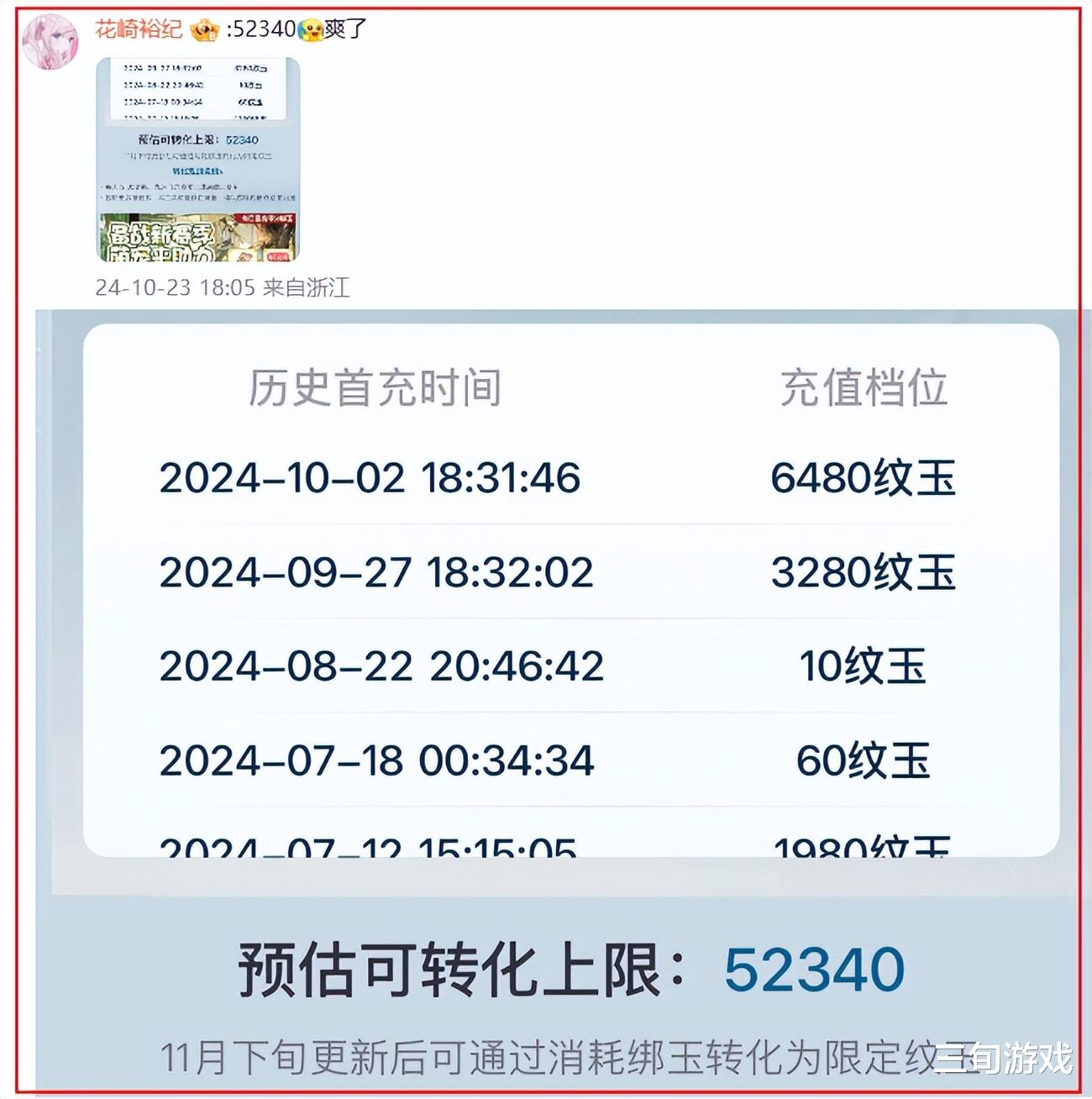 有不少玩家登陆网站查询,发现自己的历史首充双倍纹玉最高能拿到5234元,这相当于商城内所有顶奢级时装(价格288元,用半价券后144元)能一口气拿走36套。
