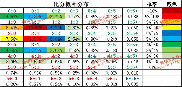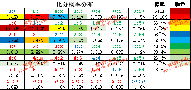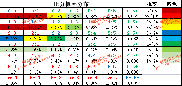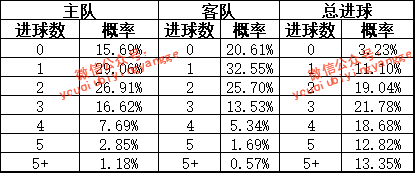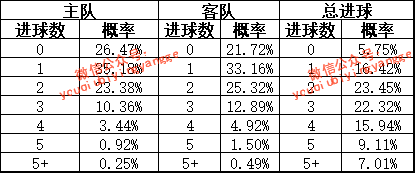 根据近20场技术统计,主队主场场均进球1.7个,场均失球1.7个;客队客场场均进球1.3个,场均失球2.2个。根据模型测算,本场主队进球数、客队进球数及总进球数的概率见下表: