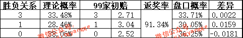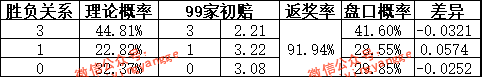 最终,经过模型推算得出的胜平负概率以及根据机构开盘数据计算的胜平负概率见下表: