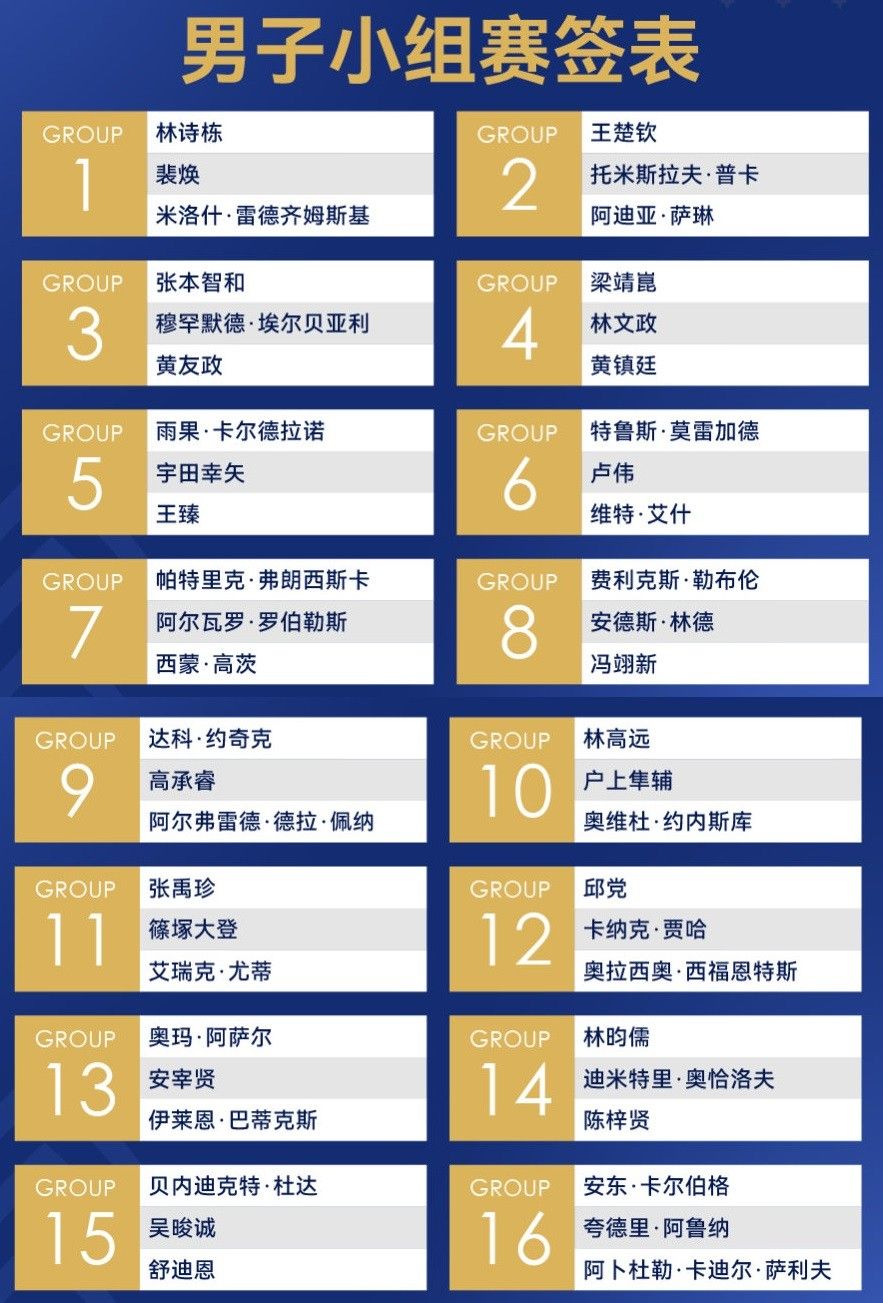 男子单打赛场,新加披大满贯2025冠军、世界排名第一的中国选手林诗栋被分入第一组,将与澳大利亚选手裴焕及波兰选手米洛什·雷齐姆斯基展开较量。