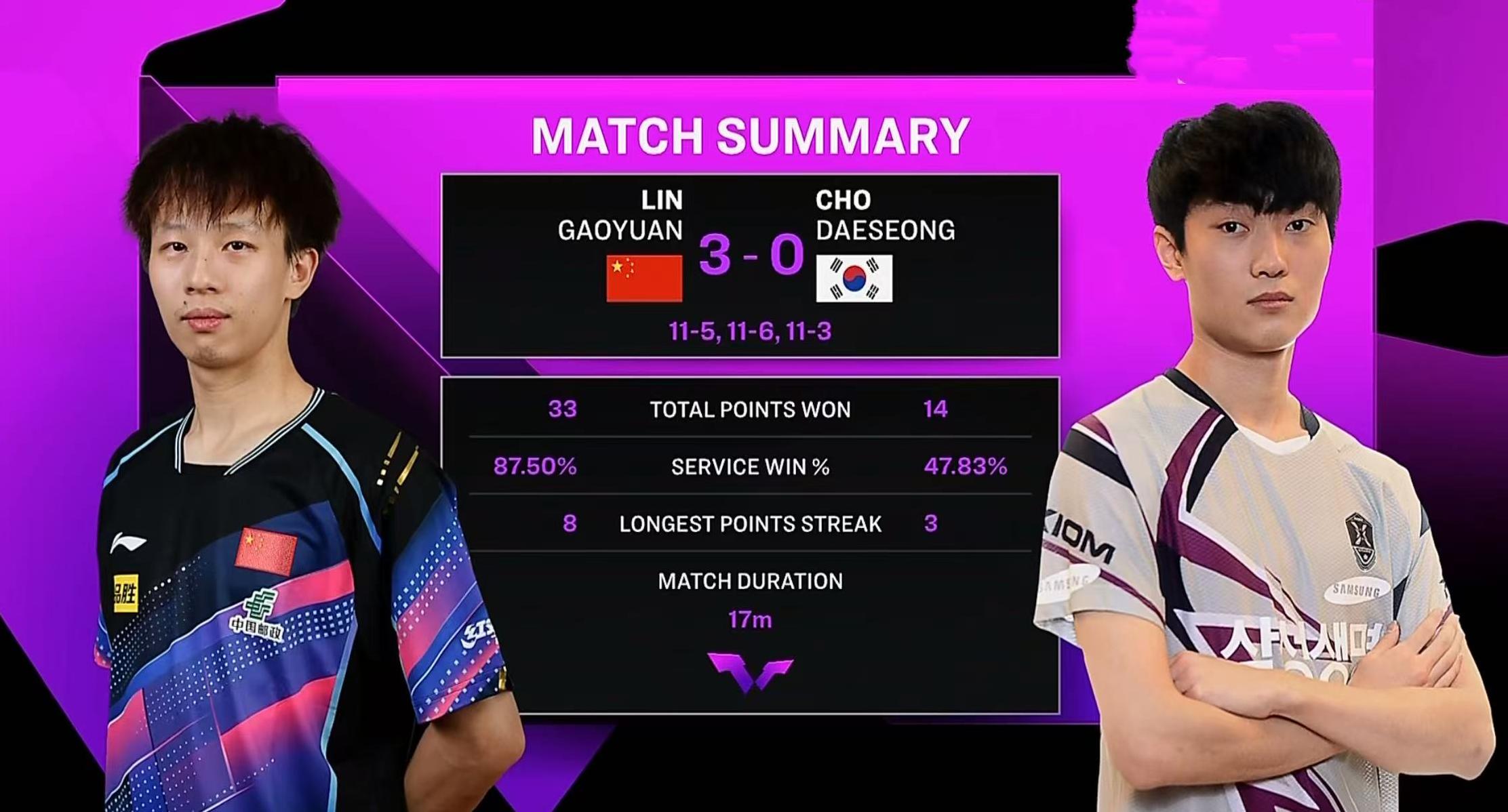 林高远几乎不给赵大成任何喘息的机会,以11-3结束战斗,以大比分3-0横扫对手,成功晋级男单16强。