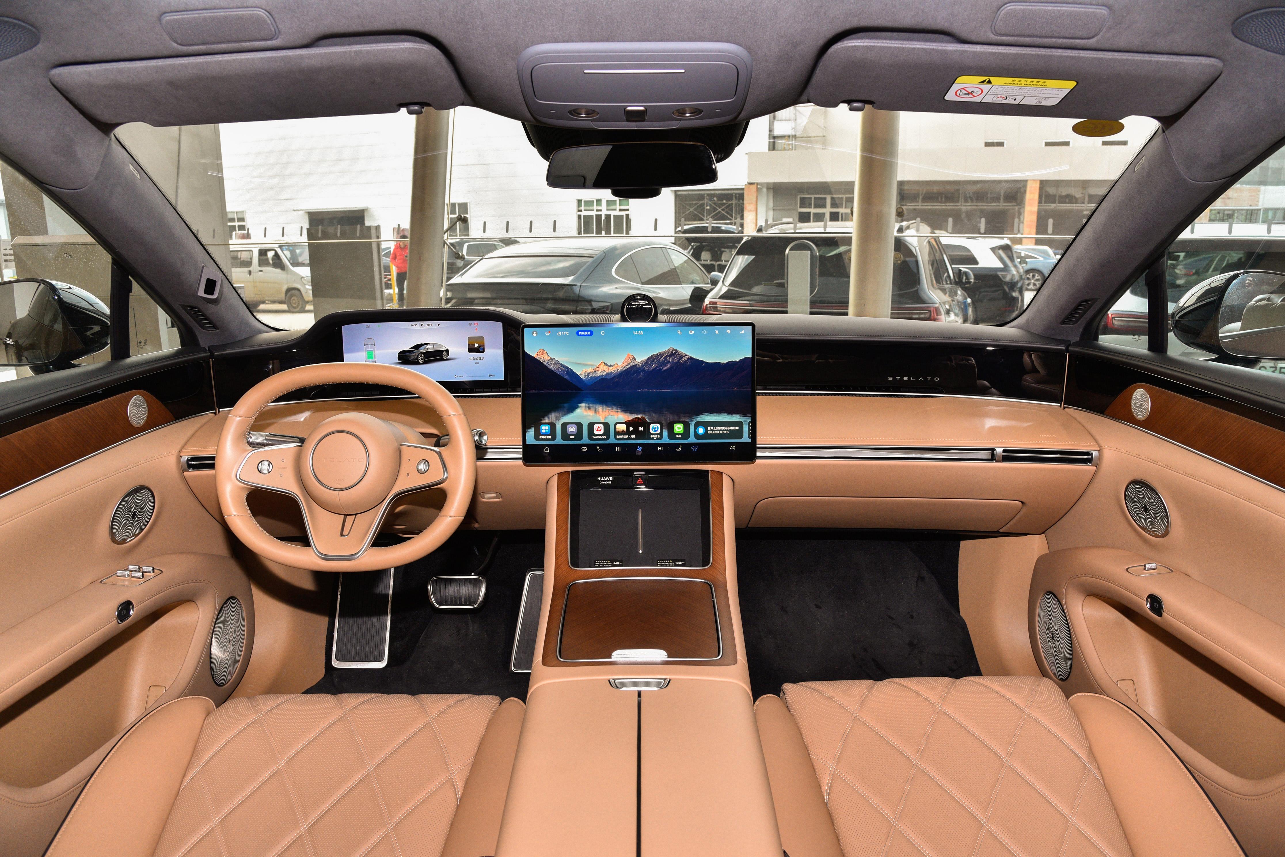 进入车内,大面积的软性材质覆盖的内饰很有质感。车内采用中正对称布局,配备12.3英寸液晶仪表和15.6英寸悬浮式中控屏,下方配备带散热功能的无线充电板。智能星环的设计将仪表盘、中控屏以及两侧流媒体外后视镜显示屏无缝衔接,确保内舱布局规整、视野开阔。享界S9车机搭载HarmonyOS 4操作系统,支持四区域智能语音交互、人脸识别、声纹识别、隐私声盾等功能,还支持HiCar、高德地图、车载KTV、5G车联网、手机APP远程功能和OTA升级等丰富功能。