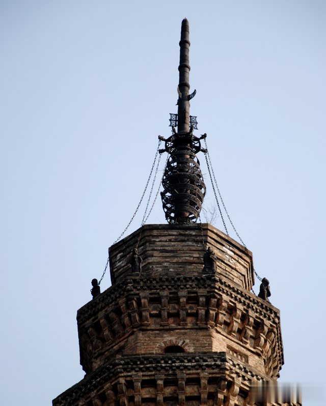 辟支塔塔身上置铁质塔刹,塔刹由覆钵、相轮、圆光、仰月、宝珠、刹竿组成。自宝盖下垂八根铁链,由第九层塔檐角上的八尊铁质金刚承接,拽拉下垂的铁链,以加固塔刹。塔刹整体造型优美,比例适度,做工精湛,还可以起避雷作用。辟支塔在古代文章及志书中有很多记载,唐天宝元年(742年)李邕撰书的《灵岩寺颂并序》碑曰“辟支佛牙,灰骨起塔”。清康熙《灵岩志》中也曰“唐天宝中建。现存的辟支塔始建于宋淳化五年(994年),历时63年于嘉佑二年(1057年)竣工,可见其工程之浩大。