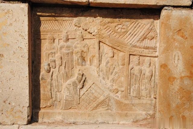 图6的画面大体可与上述中国编修的典籍对比,据此可知,殿堂中的坐者为阿育王,阿育王受诸臣朝拜,铁轮飞降,但正规经典中缺乏贴切记述。该图嵌板原应与横石题记:“尔时育王天子□□坐殿问四相王色云铁轮之处”对应。