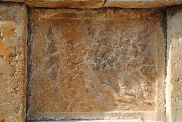 图2画面右方一王者执笏,身后一士兵扛军旗,画面左方一人骑马从山峦中走来。图3画面左上方表现翻卷的云朵,云朵中一王者骑马驰来,周围簇拥着9个军卒,其中二人扛军旗。画面右下方表现山峦。