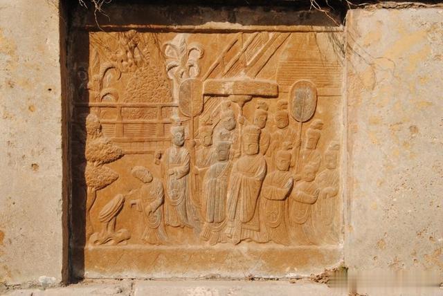 图6表现一殿堂屋顶有一轮状物,一王者坐于殿堂内,身侧立三位随侍。殿堂前阶下,一位大臣执笏躬身向王者呈奏,其后另有三大臣执笏而立。画面的上方站立三侍者及一位官员。