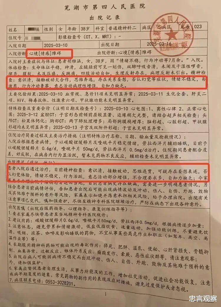 医院的出院记录看得人头皮发麻:“关系妄想”“行为冲动”“自知力缺乏”,甚至列出了药物可能导致猝死、肝肾损伤的副作用。