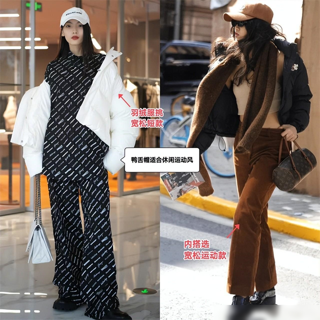 而且,运动休闲风格本身就偏向于年轻化流行感,年轻一点的模特们搭配一件短款羽绒服和一顶棒球帽,是最符合年龄段需求的,并不会因为比较活泼的着装风格显得自己不成熟。