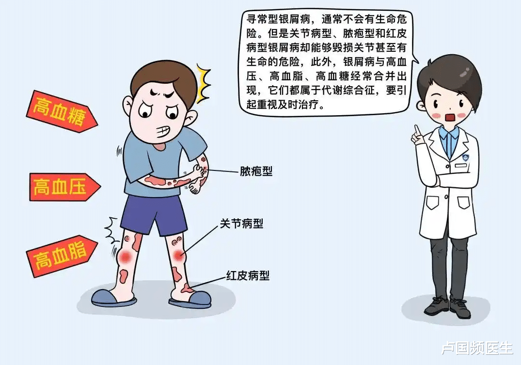 脓疱型,关节型,红皮病型则不同,它们会导致患者出现低蛋白血症,电解质紊乱,肝肾功能障碍等症状,危及生命。