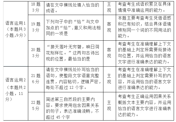 在本次试卷中,语言文字运用出现2道选择题,调整了试题难度,在确保学生得到基础分的同时,也为学生答题争取了一部分时间。语言文字运用这一部分试题整体难度不大,贴近学生生活,易于把握。