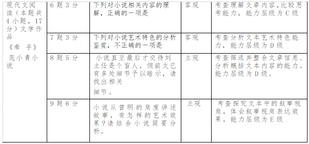 选择题考查四种基本能力:对文本的概括、对艺术手法的分析、对局部细节的描写、对全篇内容的整体把握。试卷考查内容符合新课程标准的规定,也与去年高考的考查内容和试题难度相吻合,总体上客观题趋于简单,保证了新老高考的平稳对接,对于过渡期考生的心理稳定有良好的作用,助力基础教育提质增效。范小青《牵手》一文引领学生走近日常生活,用自然而平静的目光打量现实中的一切,然后将一个物语的世界说给学生听,让学生从中体会世界的真相。