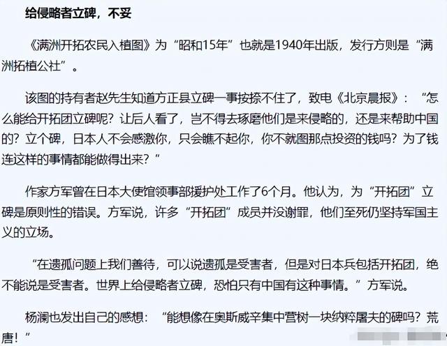 要知道,“满洲开拓团”是日本侵略者在东北实施殖民统治的工具,他们霸占中国百姓的土地,实施暴行,这样的碑文无异于为侵略者“翻案”。