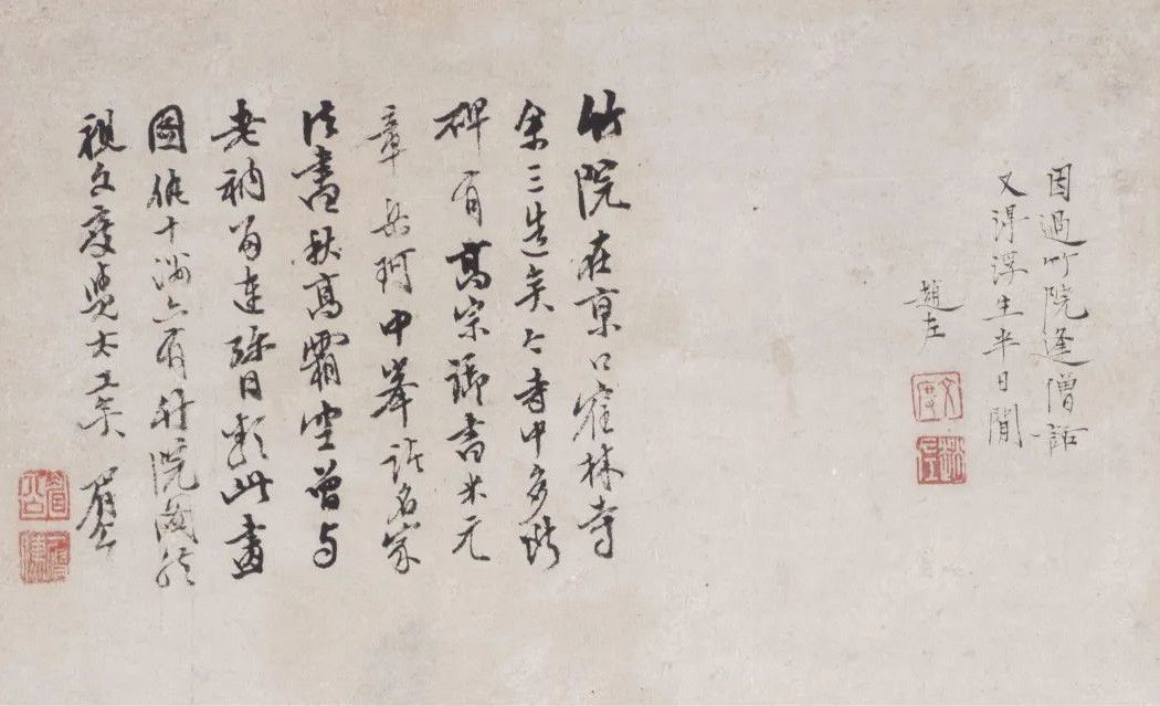 这件作品尺幅较小,都没有年款。可能绘于1615年前后,或稍晚一些,画中描写竹林间的一座茅舍,是鹤林寺僧院的一部分,位于镇江,离南京不远。画幅左上方的题识系陈继儒(1558一1639)所写,他也是出身华亭的文人及画评家,与董其昌私交甚笃;由此题识,我们得知文人经常过访此一竹院,求阅寺中珍藏的石碑,其中存有诸名家的法书典范。陈继儒写道,仇英先前曾以此竹院为题作画;如今,见了赵左此作,乃觉仇英之作“太工矣”。赵左自已的题识则不过二行:“因过竹院逢僧话,又得浮生半日闲。”