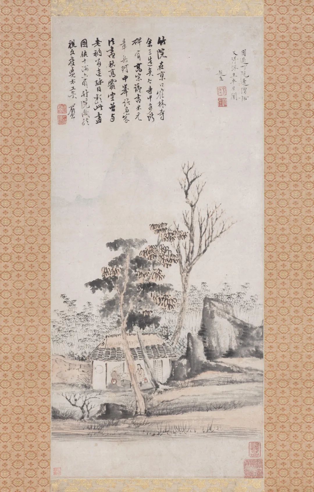 此画稳重合度,并不压迫观者的感官经验。石块受光的效果虽具自然主义特质(如米泽嘉圃所观察),然则,由于画家处理的方式极为柔和,而且画面的空间也相当中性,因此,并未像1616年的《寒崖积雪》轴那样,使观者强烈而自觉地意识到一种侵略感。地面的线条及树木一一屋前两棵,屋后一棵一一不但描写得极为轻盈和缓,同时也尽其可能或竭其所需,务使画面的中景空间维持开阔。画面左上方有一微弱暗淡的山坡,正好足以将画纸上方的空白地带,转化为具有表现力的留白效果;除此之外,画面上最远的界限乃是竹林。此画的构图简单、清晰而且令人满意:从左下方开始,一路斜上发展至右侧石块的位置,我们可以看见一排墨色较深的造型,沿此对角线排列,如此,抵消了其他物形的水平与垂直线条结构,同时,这些水平、垂直线条也被弯成轻松流利的孤线。茅舍也还是穿过树间才能看到;舍中有一僧人及其座上客一一赵左本人乎?一一二人正在展读几上的书卷。与人物的身形相比,建筑物显得出奇地窄小,其形状受到扭曲变形,目的在于排除观者对空间所生的错觉之感,以免任何突元的视觉干扰。在此,赵左所记录描写的,乃是一种文化性的习俗或仪式,就整体而言,新式的自然主义可能并不适合这一类的画题;元代大家及沈周才是正确的典范。