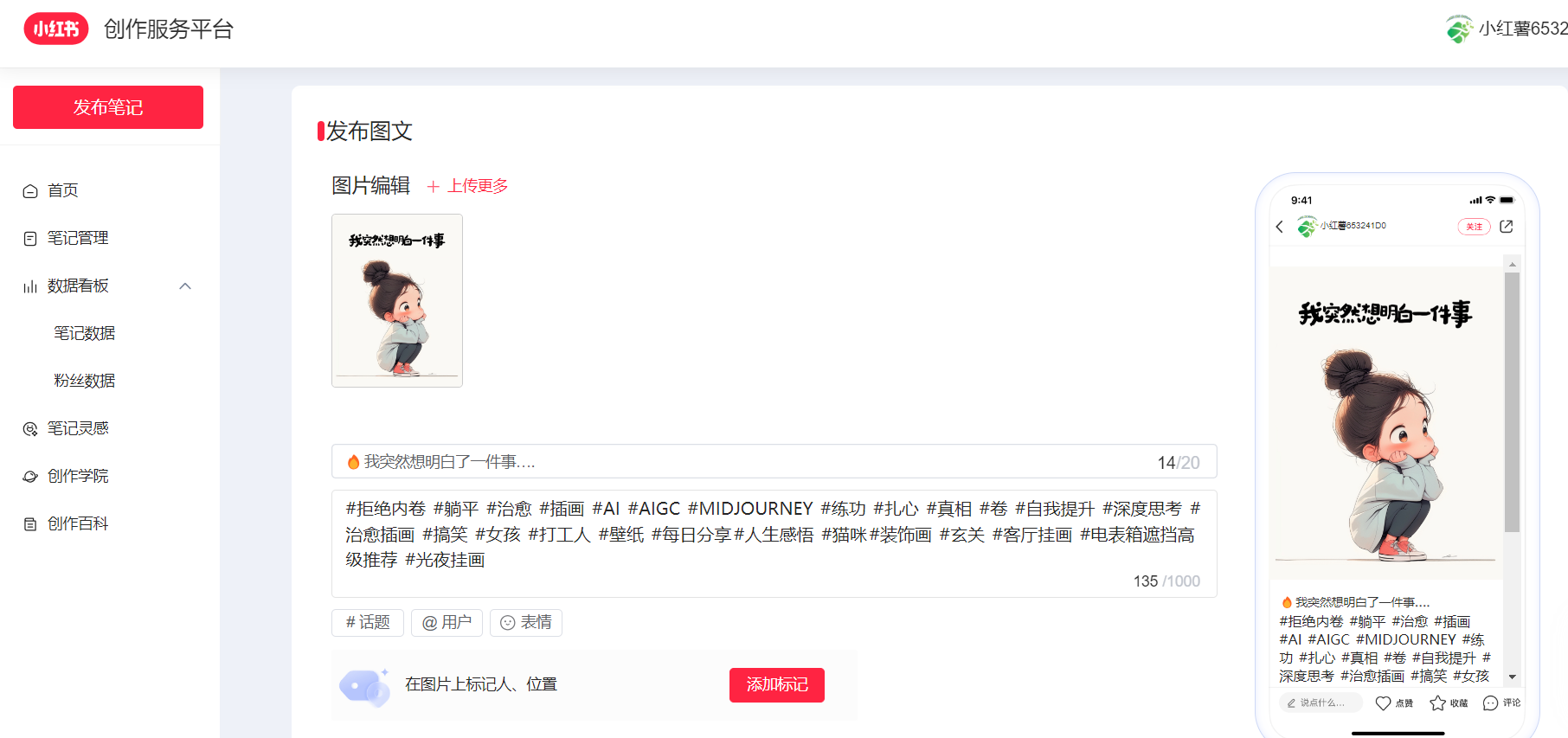 生成图像后,我们需要在小红书上发布帖子。具体步骤如下: